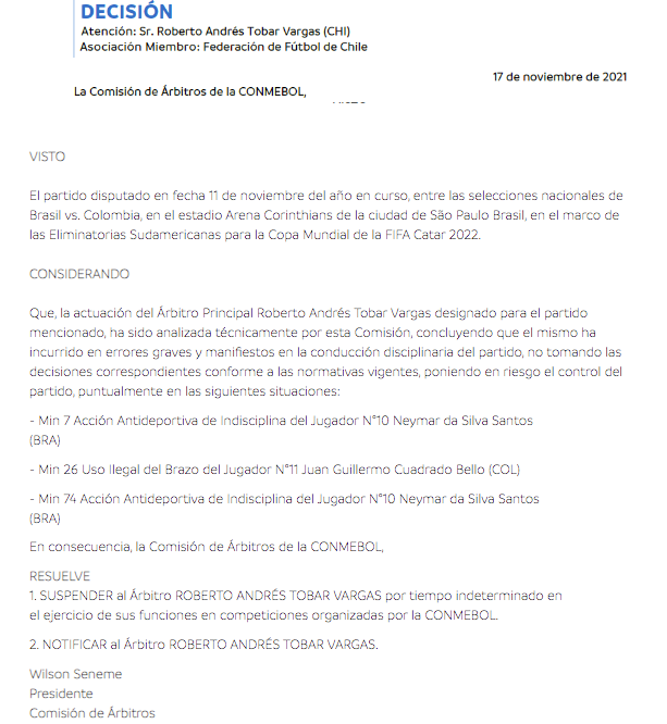 Esto debido a que hubo tres acciones específicas, que implicaban incluso una expulsión para Neymar. Según el informe, Tobar incurrió en errores "graves y manifiestos" en dos "acciones antideportivas de Neymar" y en un uso ilegal del brazo de Juan Guillermo Cuadrado.