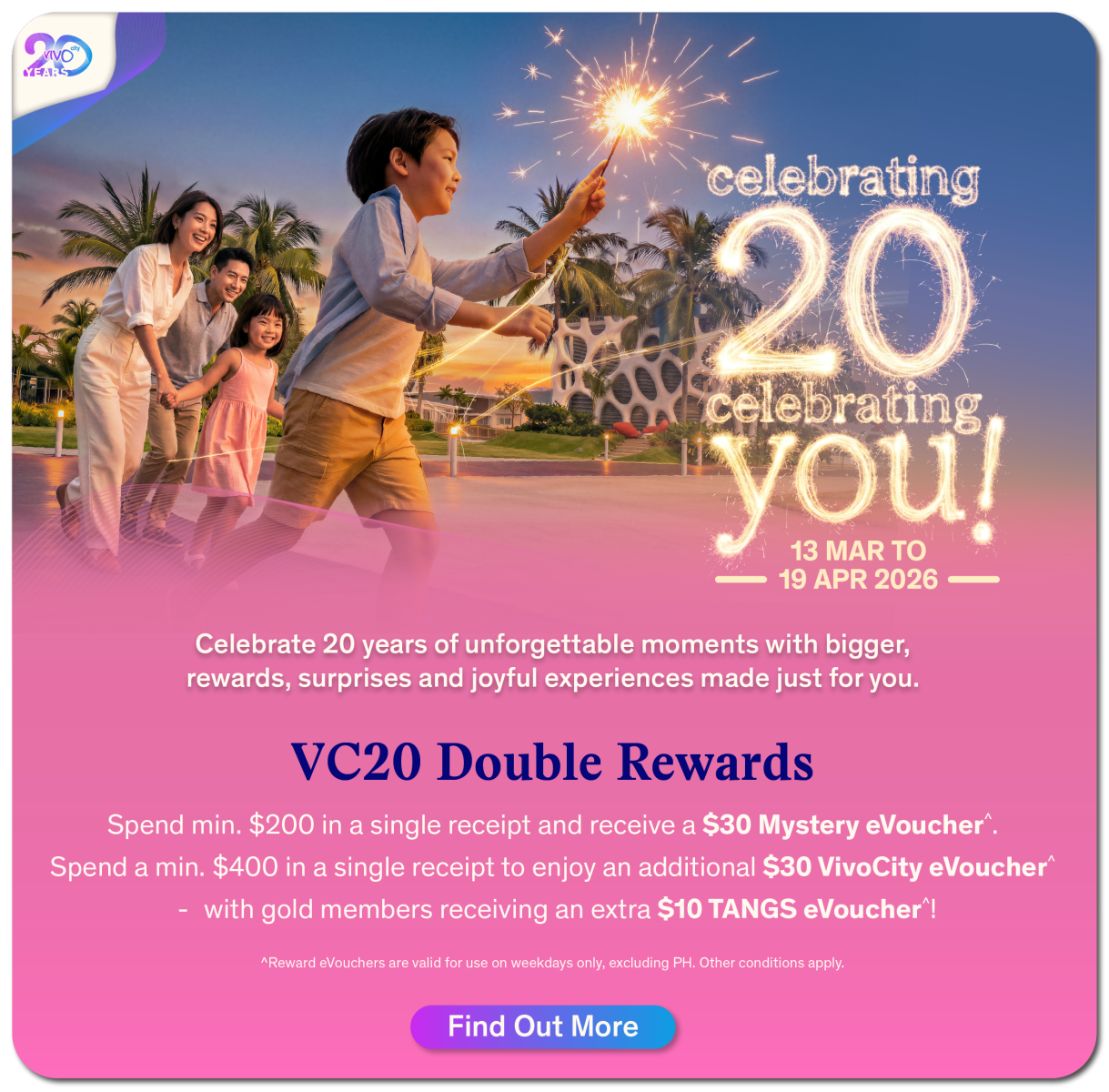 ##### Reward eVouchers are valid for use on weekdays only, excluding PH.[Other conditions apply.](https://www.vivocity.com.sg/celebrating-20-celebrating-you-t&cs)