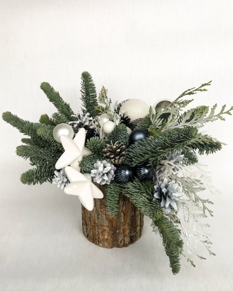 - **Стол**. Здесь размещаются хвойные икебаны в вазах, корзинках, ящиках или кашпо.