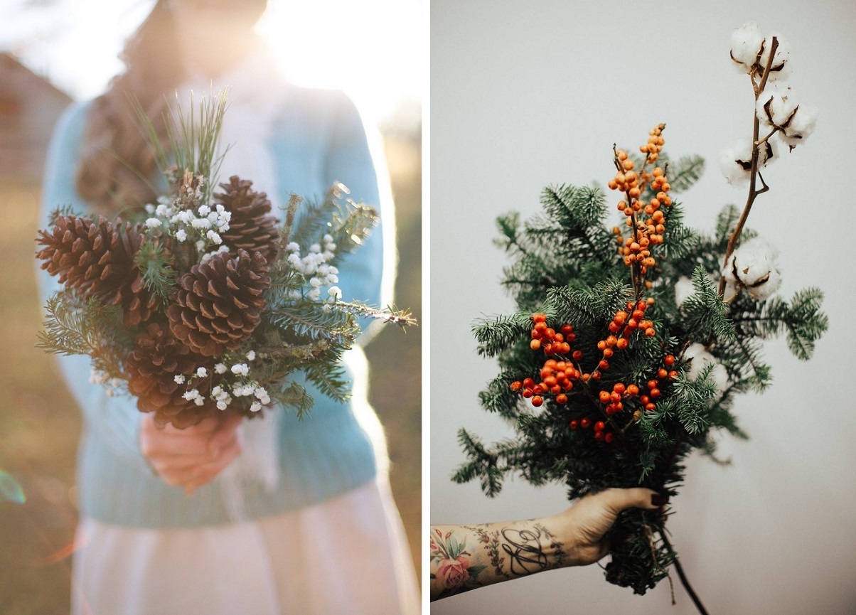 3. Покройте некоторые части хвойного букета обычным клеем ПВА, затем аккуратно припорошите их искусственным снегом, как на представленной фотографии.
