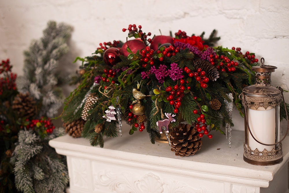 Чтобы рождественская флористика гармонично вписывалась в интерьер, важно позаботиться о ее сочетании с другими видами праздничных украшений. Например, хорошим вариантом будет использовать декор, присутствующий на новогодней елке — игрушки, бантики, гирлянды.