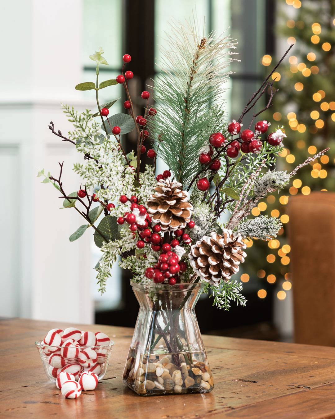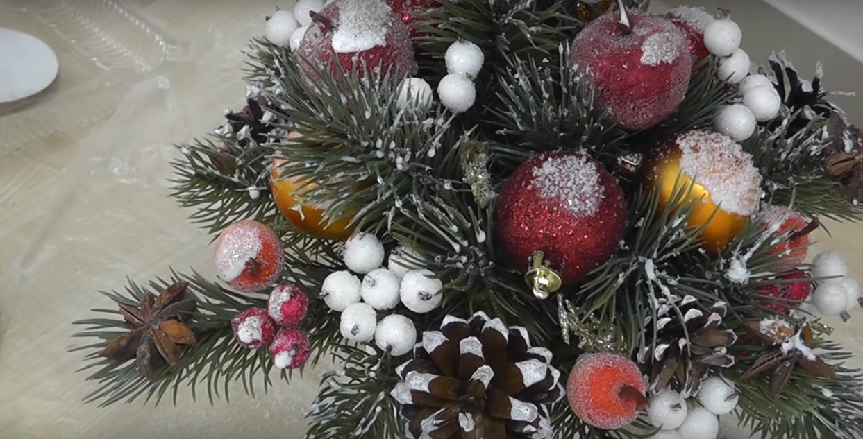 2\. Распределите оставшийся декор новогодней икебаны: крупные элементы нужно разместить по краям букета, а мелкие украшения лучше оставить для центра. Все просветы должны быть заполнены.