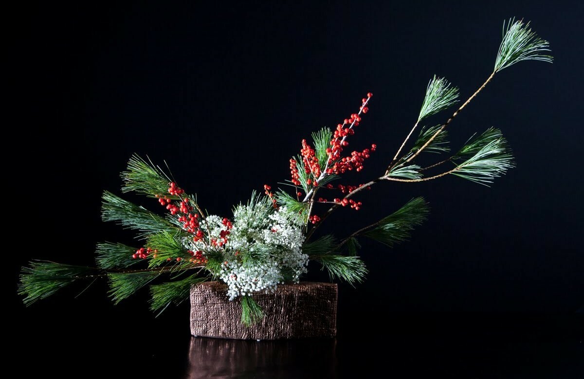 Традиционные новогодние икебаны делают из природных материалов — еловых веток и шишек, сушеных ягод и фруктов, ароматных пряностей. В качестве основы принято использовать живые хвойные веточки, которые наполняют дом поистине праздничными ароматами. Кстати, особой популярностью в последнее время пользуются цветки хлопка, которые размещаются на зеленой основе вместе с засушенным кружочками апельсинов, палочками ванили и корицы.