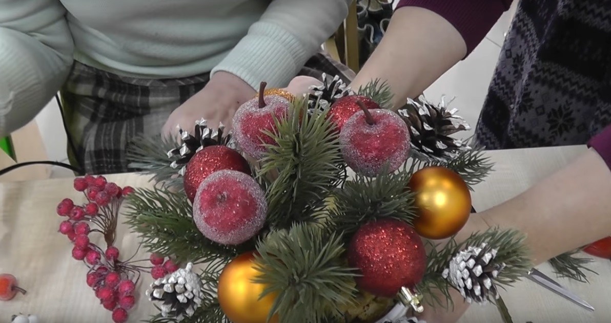 2. Распределите оставшийся декор новогодней икебаны: крупные элементы нужно разместить по краям букета, а мелкие украшения лучше оставить для центра. Все просветы должны быть заполнены.