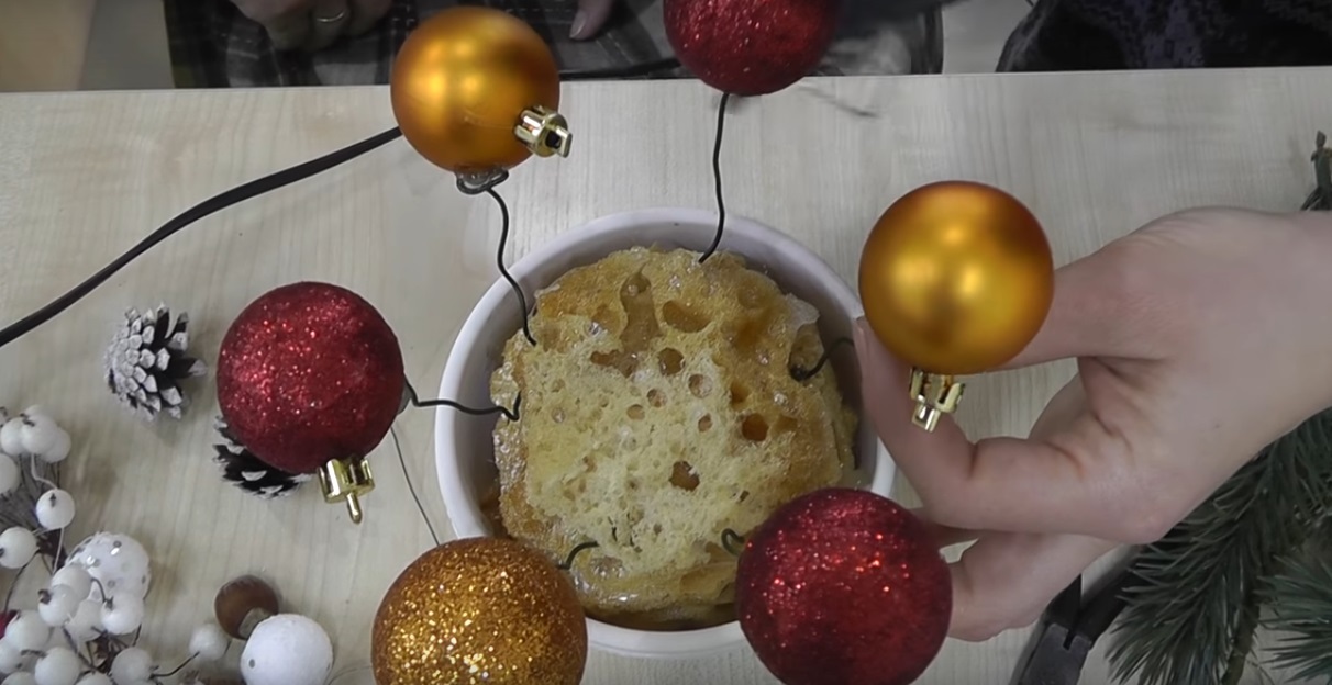 1. Приклейте к елочным шарикам небольшие отрезки проволоки (около 10 см), после чего разместите игрушки на островке из пены, параллельно начните устанавливать веточки.