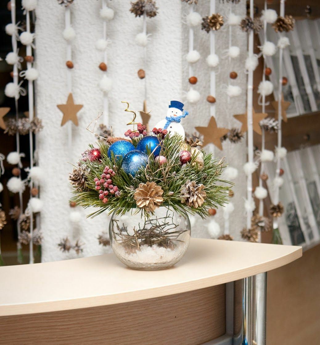 Выбор праздничной поделки зависит от места ее размещения — локация поможет определиться с формой, размерами, а также системой крепления будущего изделия. Сделанная своими руками новогодняя икебана сможет украсить: